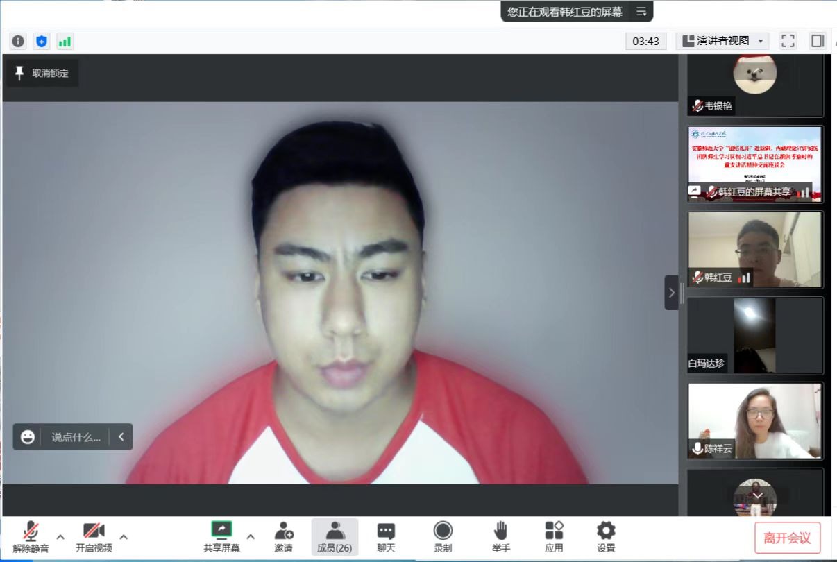 7月12日至15日,中共中央总书记、国家主席、中央军委主席习近平在新疆考察。7月16日,地旅学院积极行动,组织该院国家级暑期社会实践重点团队——安徽师范大学“团结花开”边疆少数民族学子赴新疆、西藏理论宣讲实践团队的师生,通过线上开展学习贯彻习近平总书记在新疆考察时的重要讲话精神交流座谈会,地旅学院党委副书记乔静、团委书记陈祥云、团队指导教师代表以及全体队员参会,会议由陈祥云主持。
