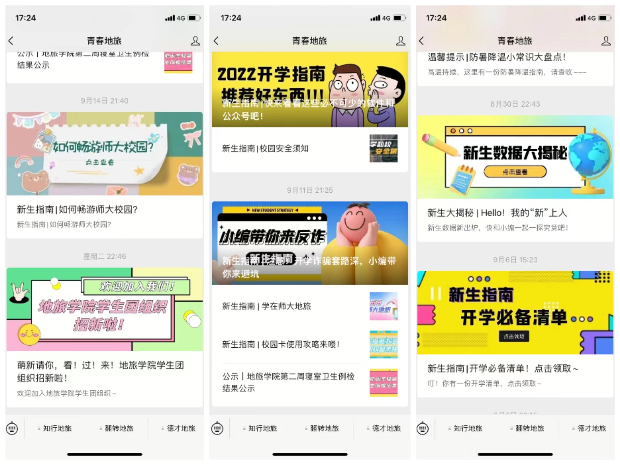 为使2022级新生更快了解专业特色学院精心设计,为新生准备了线上线下“新生大礼包”。“线下大礼包”其中包含学院定制LOGO及院训的入学纪念帆布袋,装有口罩、酒精消毒湿巾、免洗手消毒凝胶、定制红色便携包的防疫包、城乡规划专业特色手绘师大风景明信片、导师推荐阅读书目和新生寄语的定制书签一套学院学生工作风采“线上大礼包”则是通过青春地旅微信公众号推送,涵盖“入学须知”、“防疫知识”“校园卡使用”、“防电信诈骗”等内容丰富的新生“电子大礼包”。