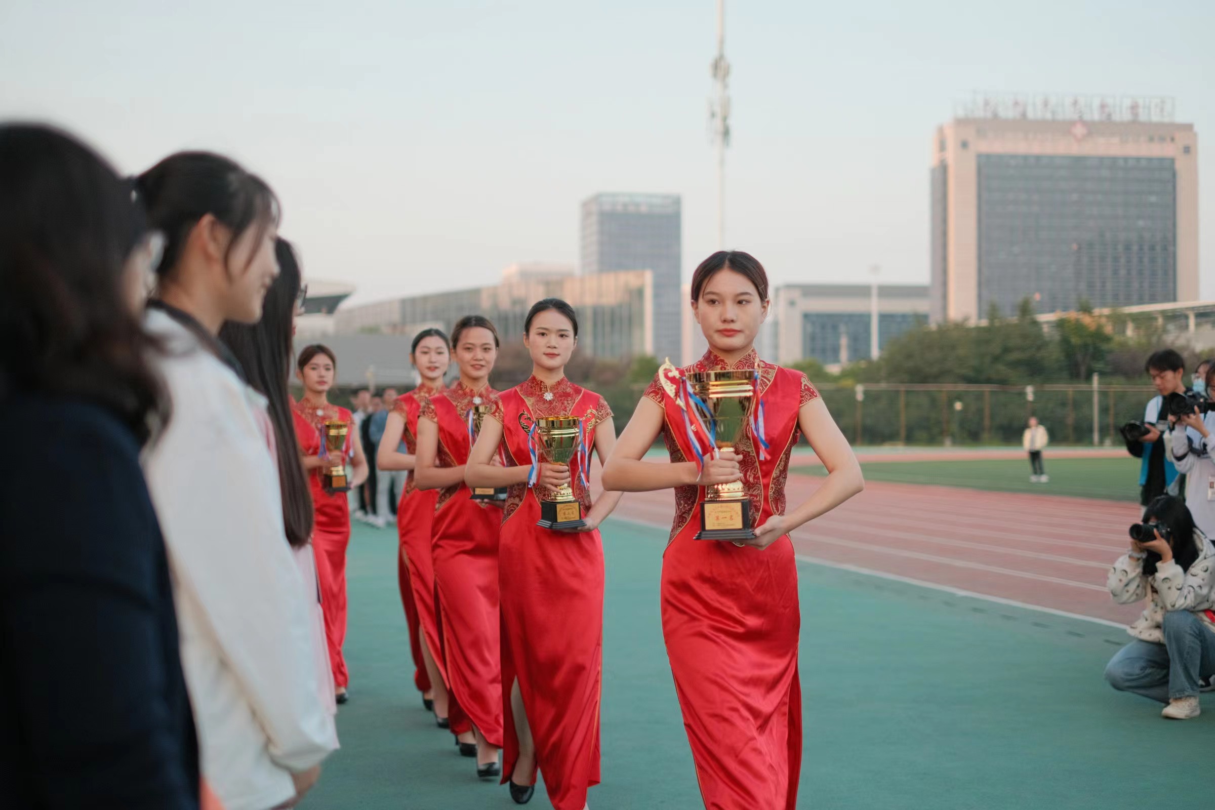 根据学校指示安排,礼仪队承揽了本届校运会领导入席、方阵引导及颁奖接引等一系列礼仪服务工作。赛场上,礼仪队员手持引导牌,身着红色旗袍,引领各院方阵入场;看台上,礼仪队员暖心服务,礼貌大方,接引领导老师入席就坐;奖台旁,礼仪队员不畏绵绵细雨,始终保持微笑,献上鲜花与奖杯,真诚祝贺每一位获奖选手……