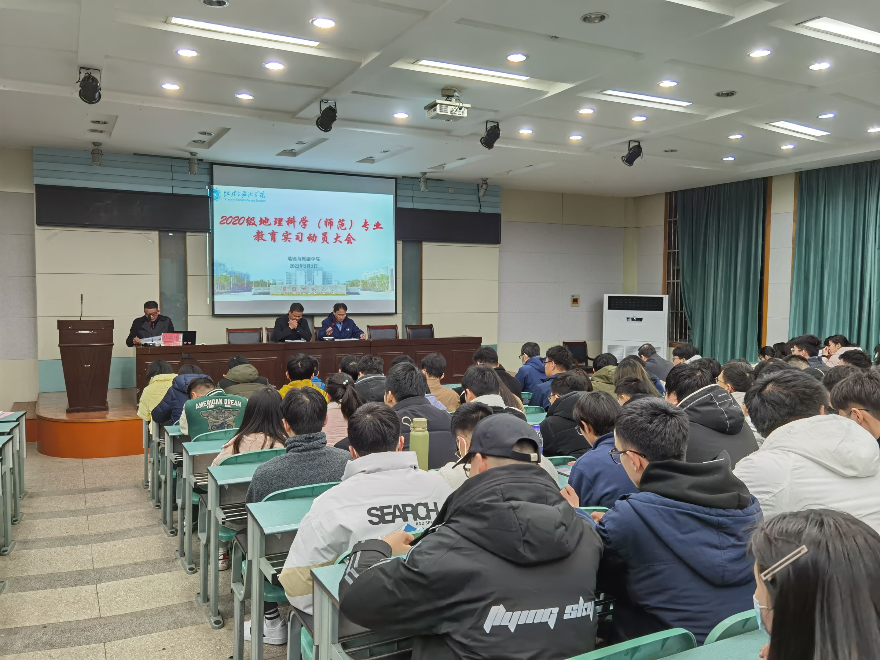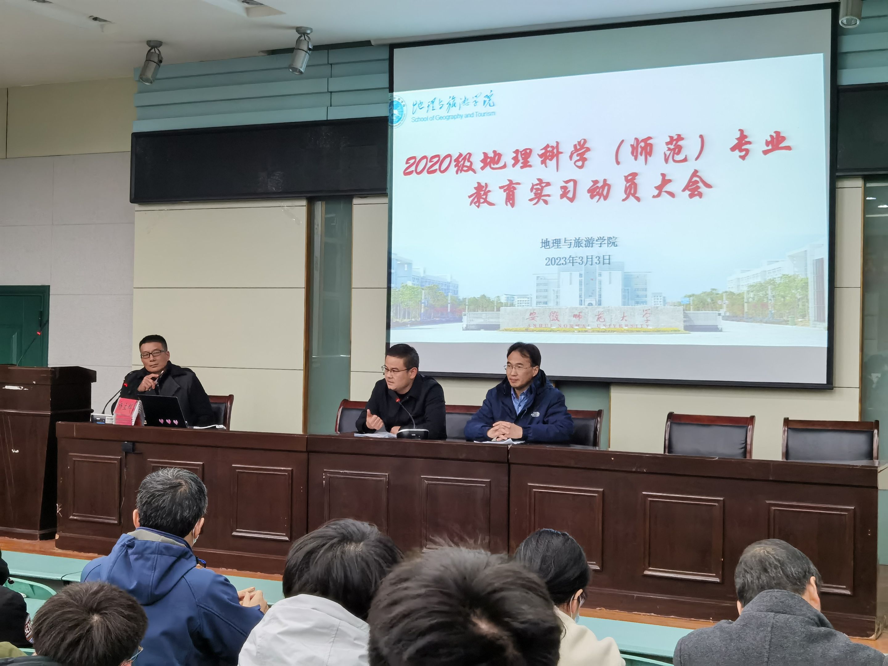 本网讯(刘思圻 彭媛媛)2023年3月3日,2020级地理科学(师范)专业在8858cc永利唯一官网实验楼101报告厅召开教育实习/研习动员大会。大会由地理专业负责人朱永恒主持,地旅学院党委副书记付勇、教学副院长杨兴柱出席会议,教育实习全体指导老师、辅导员彭媛媛、 2020级地理科学(师范)专业全体学生参加会议。