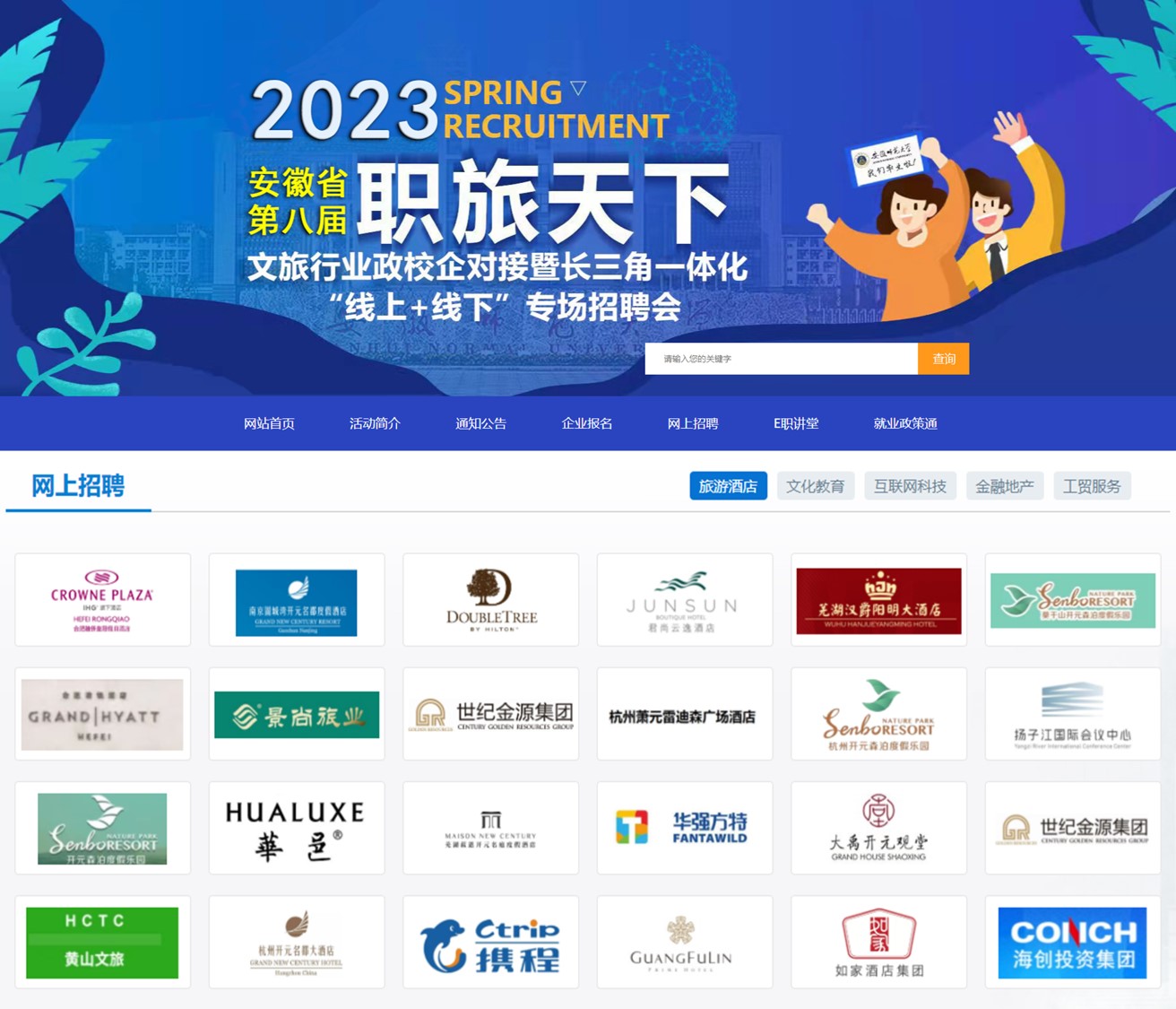3月10日,由全国普通高校毕业生文旅艺术行业就业创业指导委员会、安徽省文化和旅游厅、安徽师范大学主办,安徽师范大学招生就业处和8858cc永利唯一官网承办的安徽省第八届“职旅天下”文旅行业政校企对接暨长三角一体化“线上+线下”专场招聘会在我校成功举办。来自全国各地的近百家企业和铜陵市义安区前来招聘,提供岗位3000多个,涉及文化、旅游、教育、科技等多个门类,涵盖国内外知名酒店集团、景区、地产、规划、咨询、会展、旅行社、教育机构、互联网科技等多个业态,吸引了全校及周边高校毕业生的到来。