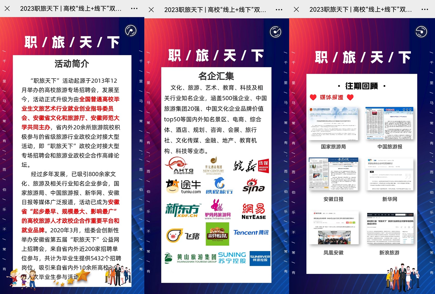 据悉,“职旅天下”系列活动自2013年创办至今,已吸引1000余家文化、旅游及相关行业知名企业,3万余人次毕业生参与,推进了安徽省旅游院校与政府、企业的交流融合,校地合作、校企合作、“洲际”英才学院、“开元”订单班等一批政校企合作项目开花结果,一批创新创业项目和教学成果奖项应运而生,积极推动了各高校旅游及相关专业毕业生就业工作。“职旅天下”专场招聘会已成为安徽省乃至华东地区“起步最早、规模最大、影响最广”的高校旅游行业政校企合作重要平台和就业品牌之一,受到了新华网、《中国旅游报》、《安徽日报》等重量级新闻媒体的广泛报道。