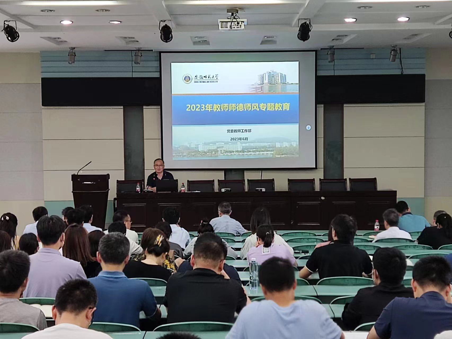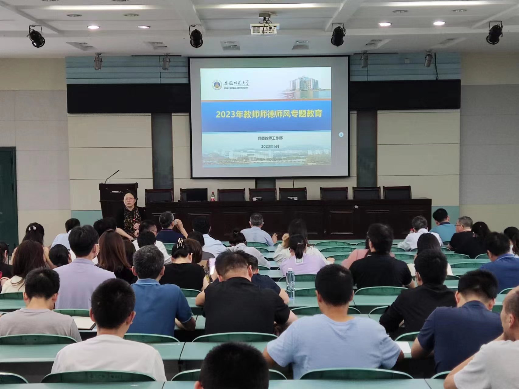 6月21日下午,8858cc永利唯一官网在院实验楼101报告厅召开全院教职工大会暨师德师风专题教育。校人事处副处长王标受邀作2023年教师师德师风专题报告,院长方凤满主持,学院全体教职工参加。