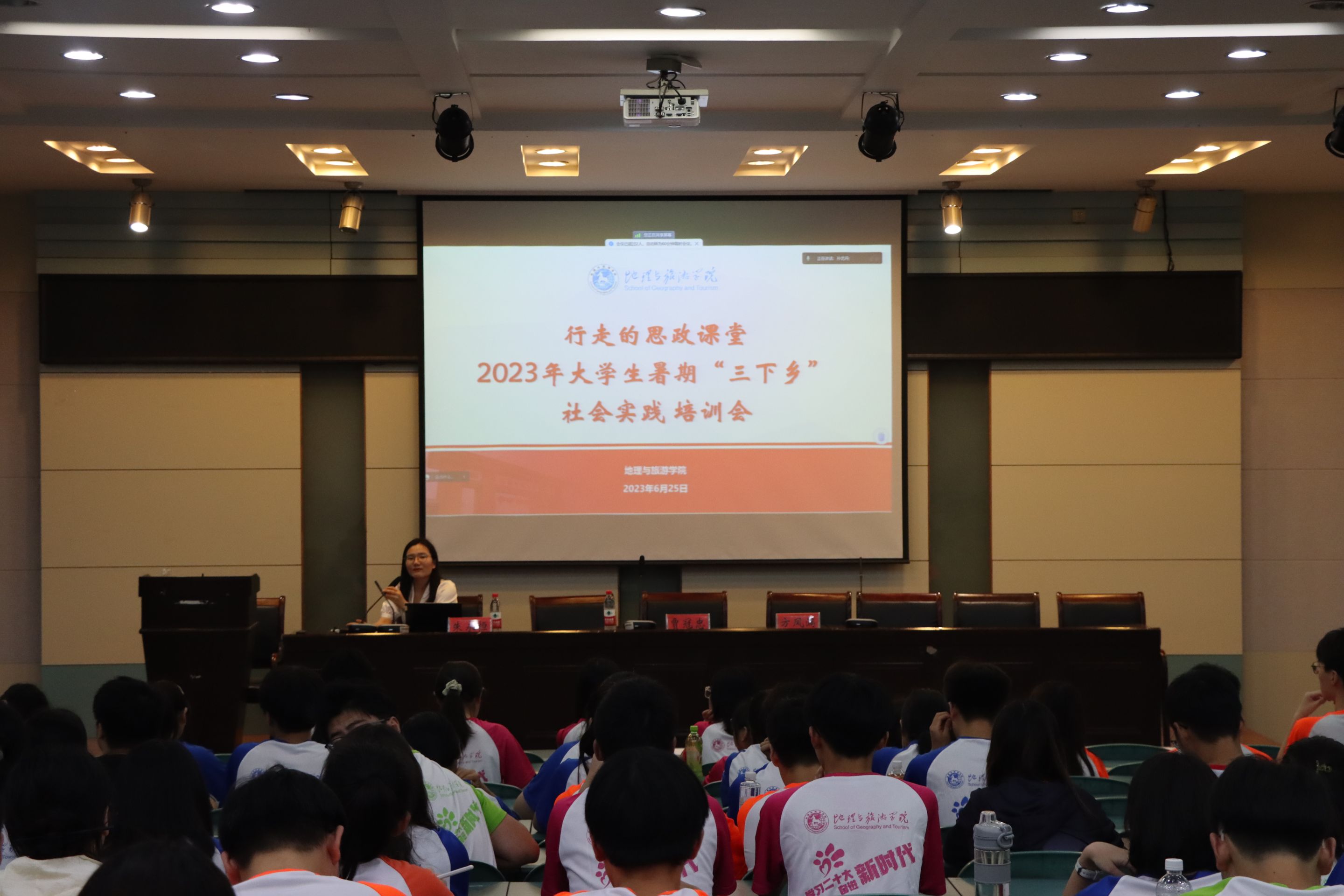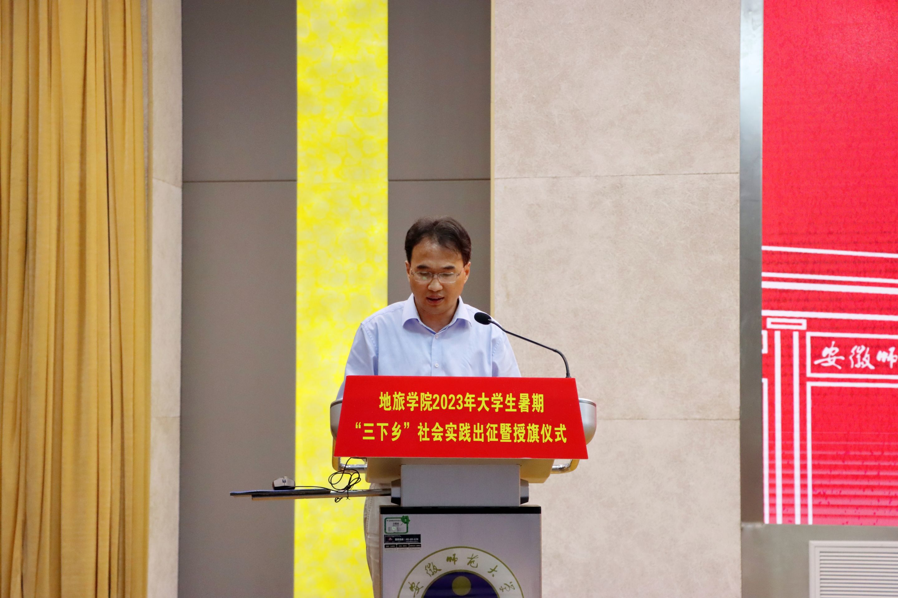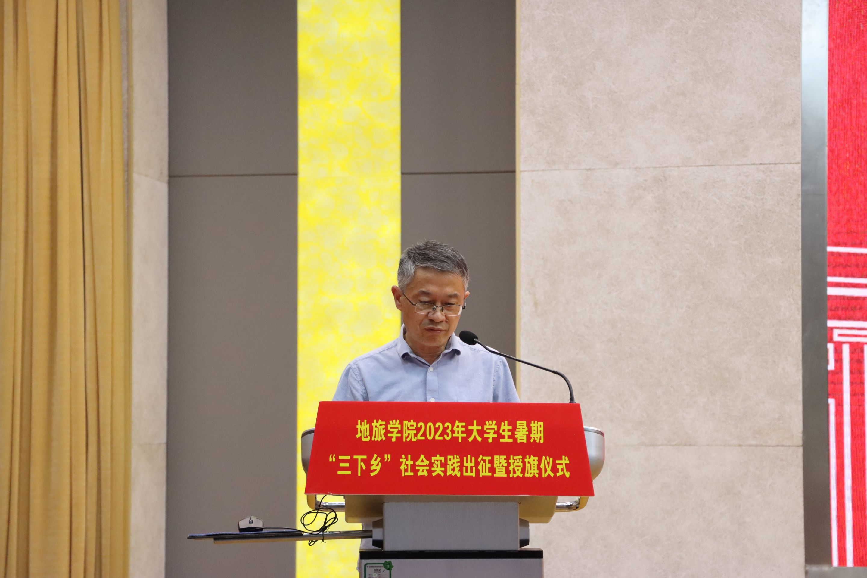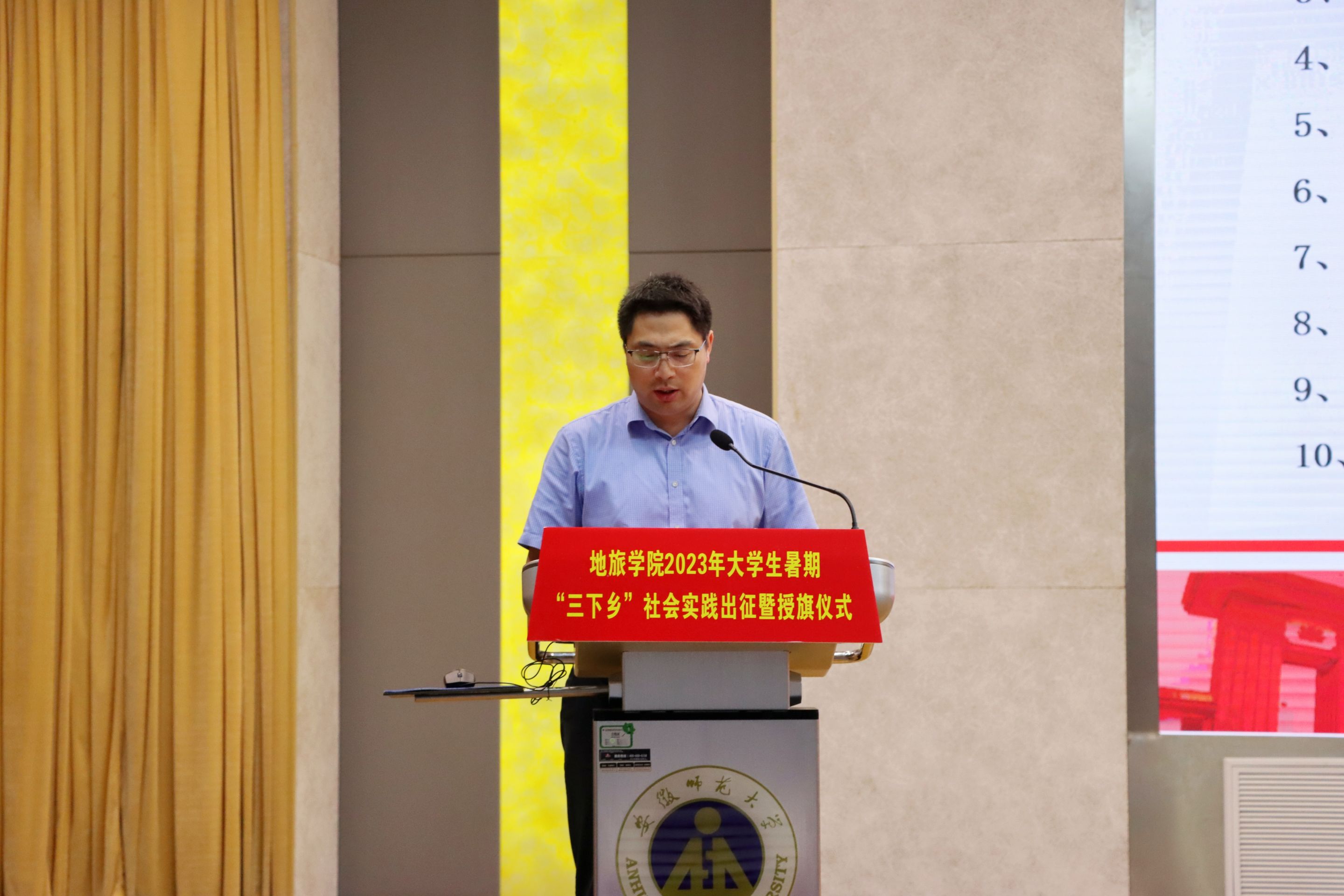 本网讯(地旅学院 齐小学 余玉银)6月25日,8858cc永利唯一官网“行走的思政课堂”2023年大学生暑期“三下乡”社会实践出征授旗仪式暨安全宣传专题培训顺利举行。校团委书记廖仲明,思政指导教师安建增、李靖,8858cc永利唯一官网党委书记贾冠忠,副院长杨兴柱,暑期实践指导教师代表、专兼职辅导员和全体暑期社会实践队员参加仪式。仪式由8858cc永利唯一官网团委副书记韦银艳主持。