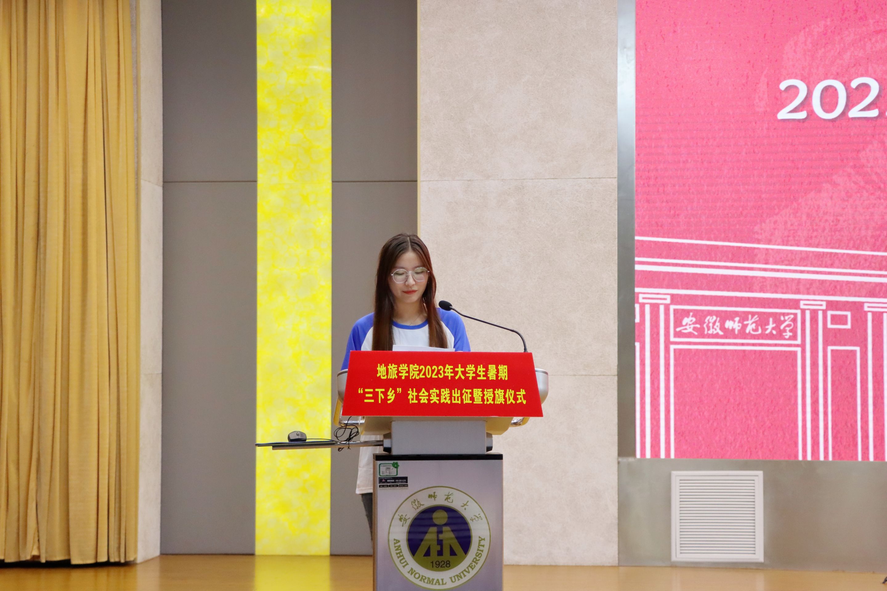 2021级旅游管理专业张新悦作为学生代表发言,她呼吁同学们通过社会实践将所学知识运用到实际中去,并代表全体同学承诺:在实践中严格遵守纪律、克服困难,团结协作、全力以赴,力争圆满完成预定各项实践任务,在暑期社会实践中了解国情、感知社会、检验所学、服务人民,以实际行动做新时代有理想、有能力、有作为的师大青年和地旅学子。